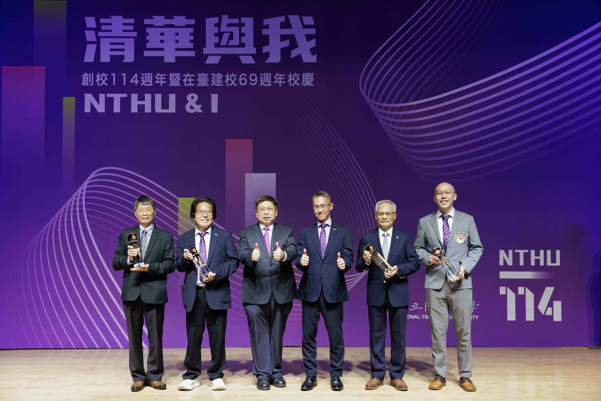 From left to right: Hsiao-Chin Tuan, Keng-Huei Ka, Simon Chen, President W. John Kao, Jau-Ho Jean, and Tsun-Gte Sun, recipients of the 2025 Distinguished Alumni Award honored during the NTHU Anniversary Ceremony.