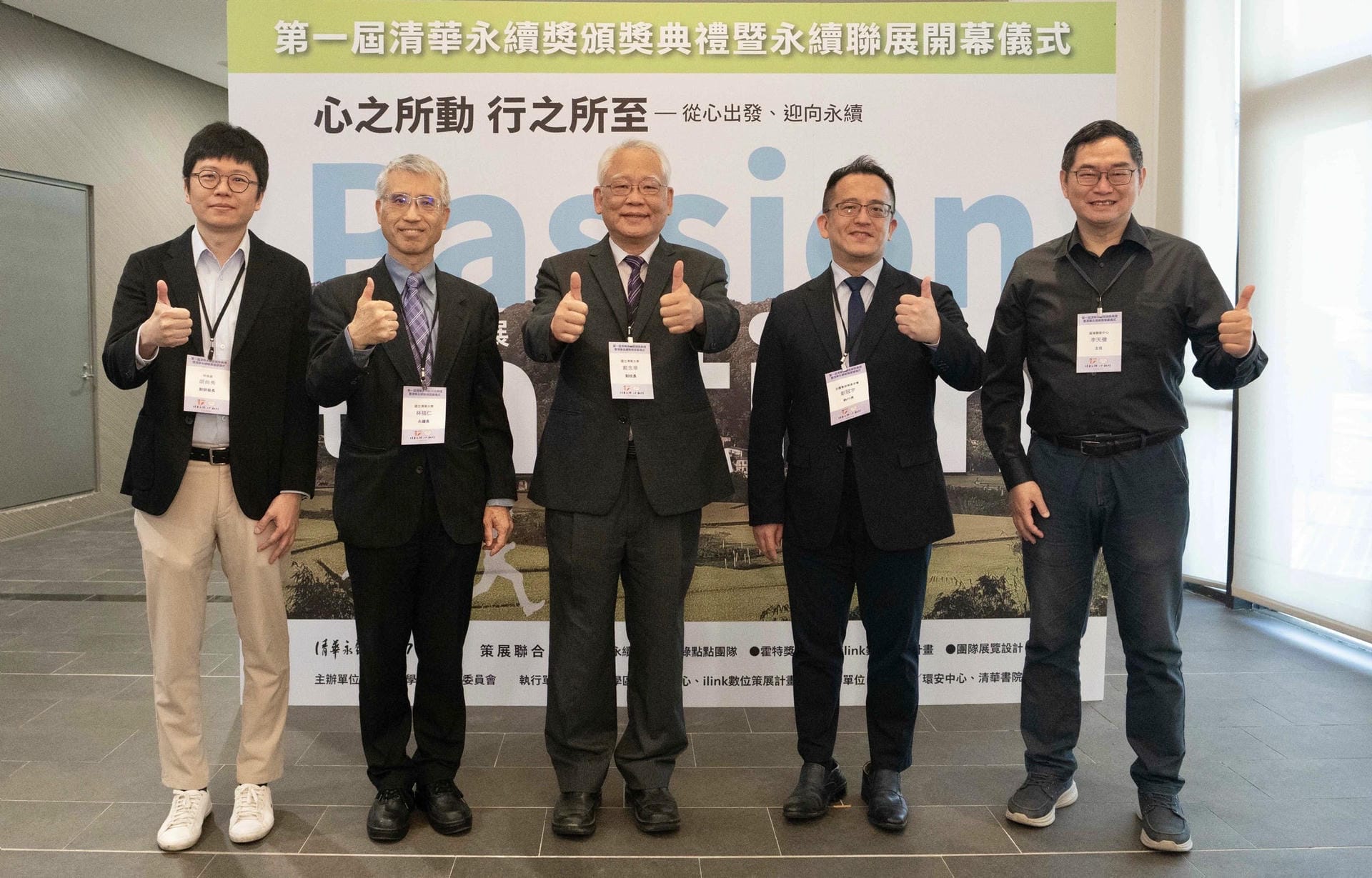 Senior Vice President Nyan-Hwa Tai (center) with representatives of the judging panel at the first NTHU Sustainability Award ceremony. From left: Shang-Hsiu Hu, Fu-Ren Lin, Brad Peng, and Tien-Chien Li.