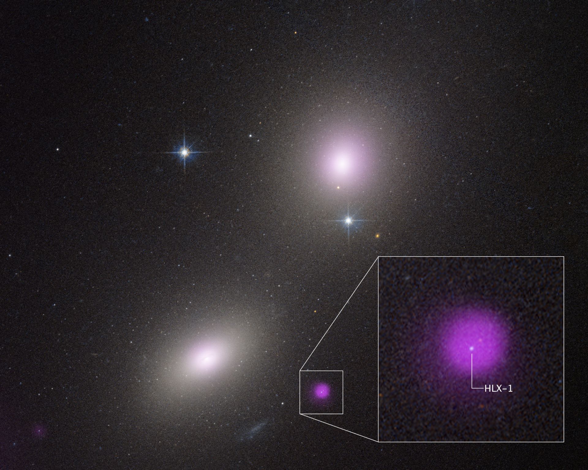 A zoomed-in view of the NGC 6099 galaxy, captured by the Hubble Space Telescope and NASA's Chandra X-ray Observatory, reveals X-ray emission from HLX-1, a strong intermediate-mass black hole candidate. (Image credit: NASA)