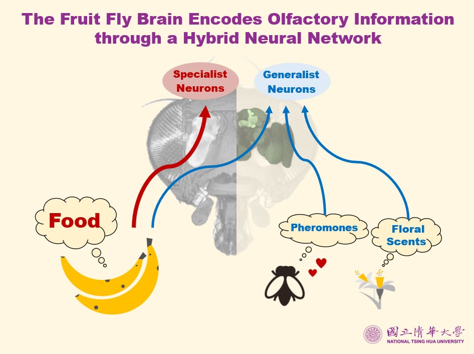 The Director of the Brain Research Center at National Tsing Hua University (NTHU) in Taiwan, Ann-Shyn Chiang, Professor of the Institute of Systems Neuroscience, Chung-Chuan Lo, and Distinguished Chair Professor of the Department of Physics, Ting-Kuo Lee, led a cross-disciplinary team that has solved the problem of how fruit flies (Drosophila melanogaster) rapidly decide to either “eat” or “escape.” The study found that their brains transmit olfactory signals through a hybrid neural network, using random generalist neurons to process common odors such as pheromones and floral scents, and specialist neurons to handle the most crucial food-related odors.