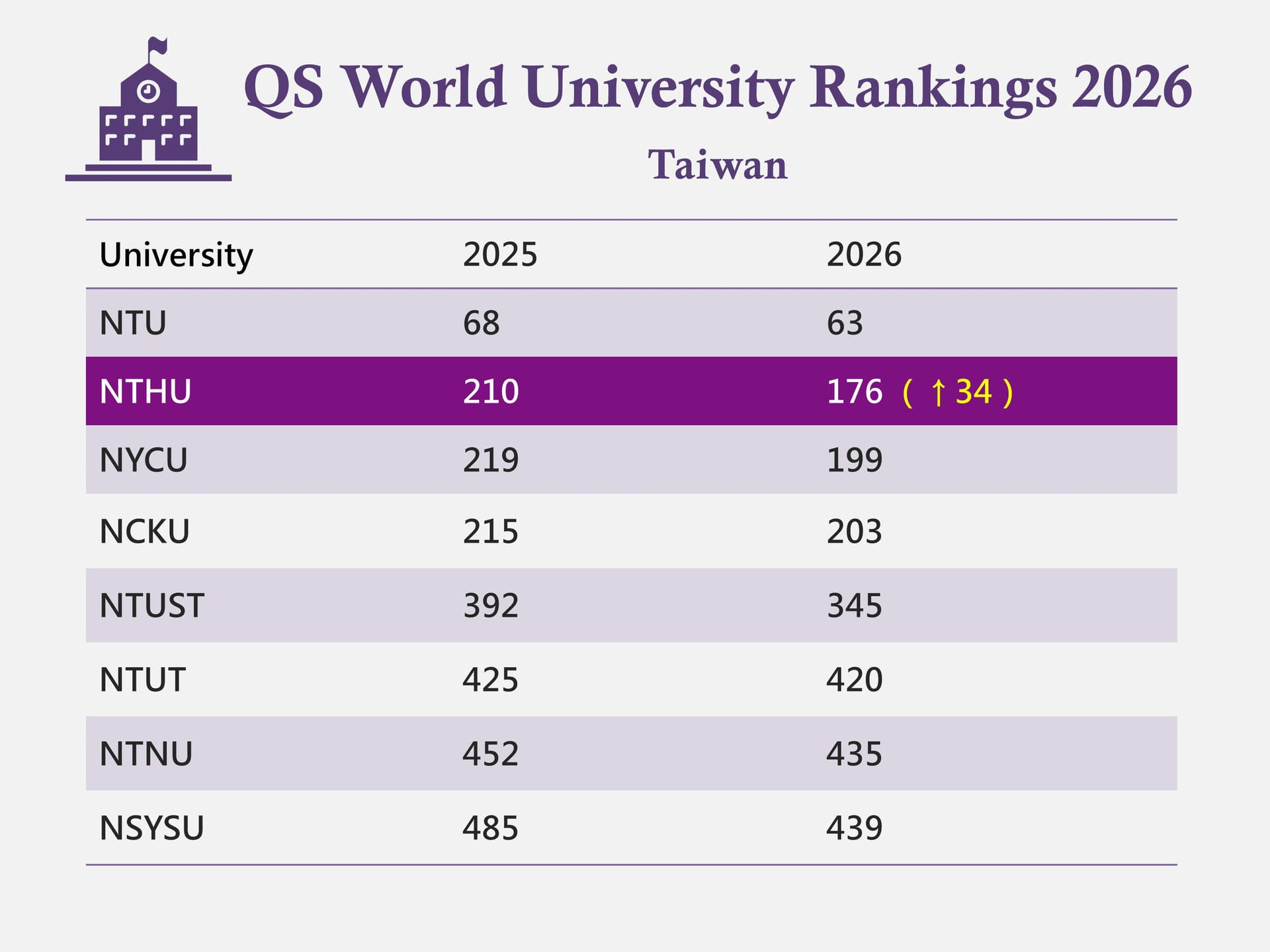 NTHU Rises to 176th Place in the 2026 QS World University Rankings