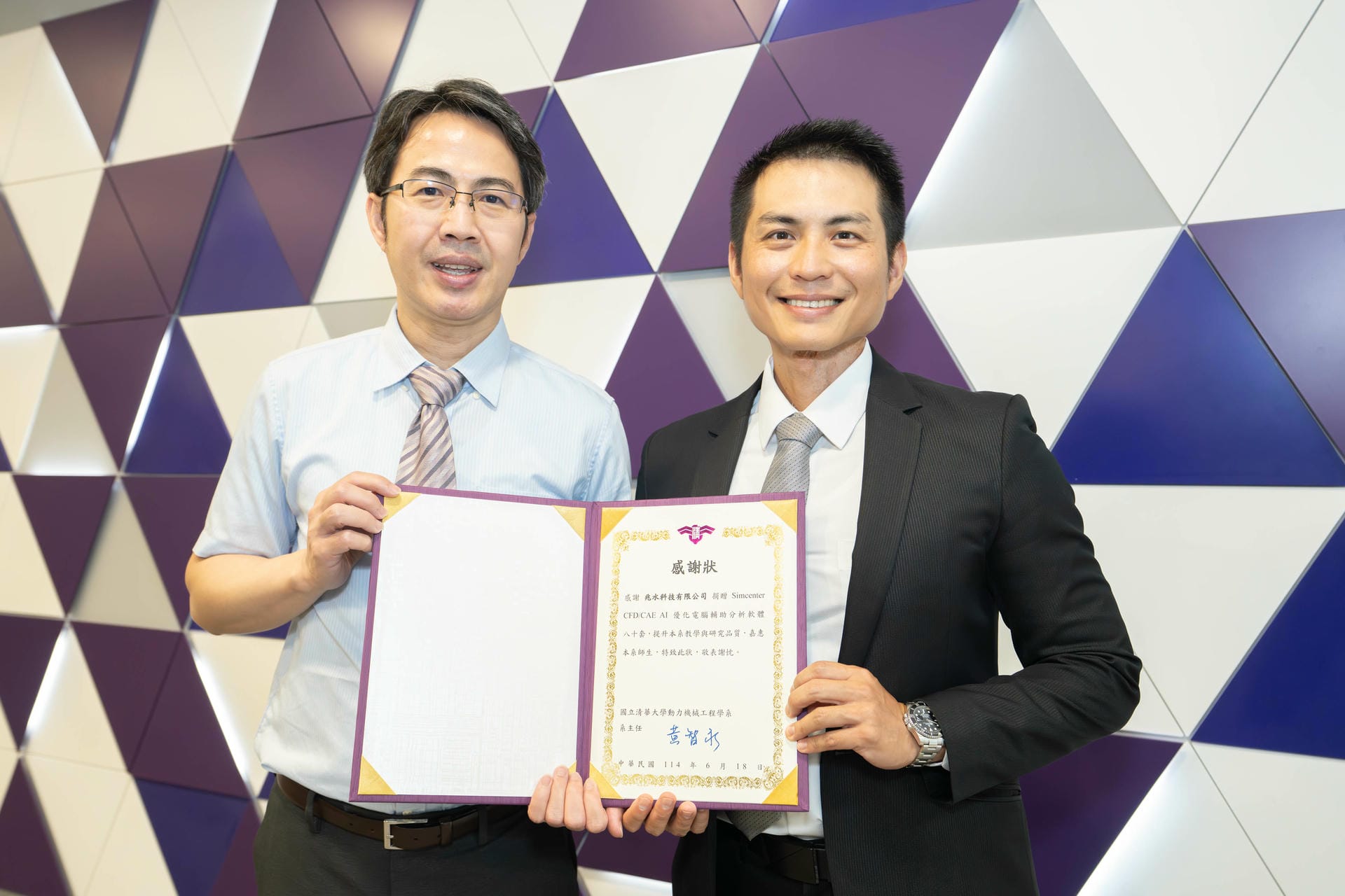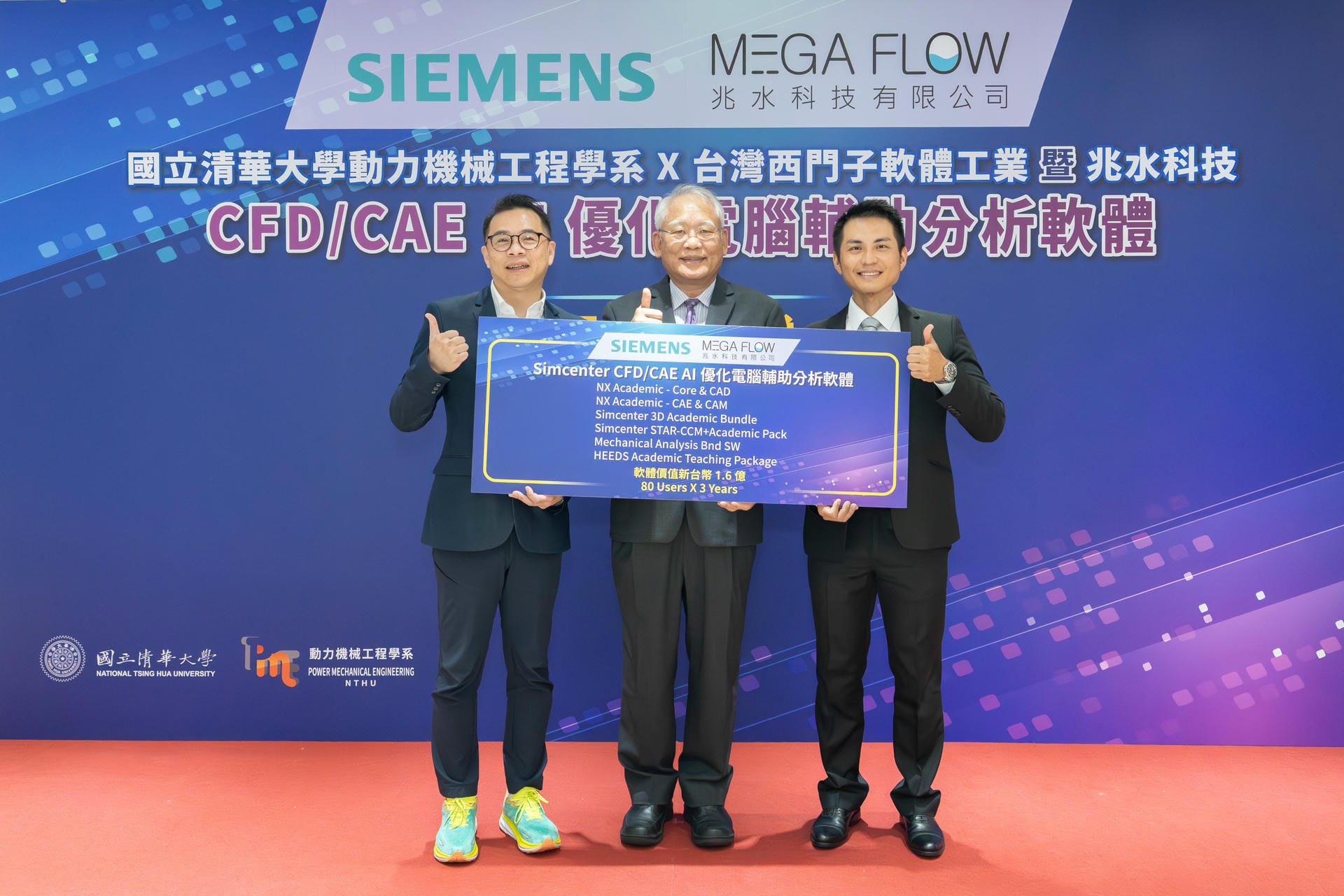 NTHU Senior Vice President Nyan-Hwa Tai accepted the donation on behalf of the university, thanking Siemens and Mega Flow Technology for their generous support. The donation will strengthen both teaching and research at NTHU, furthering the university's educational mission by helping students become familiar with the software used in industry and by narrowing the gap between learning and practice.